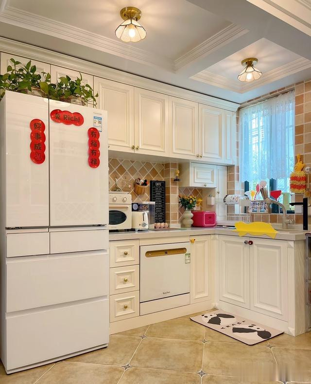 厨房的面积是10平方米,面积不大开放式设计,宽敞明亮。奶油风布置非常的美观耐看,厨房是L型的布局。每一个区域都是独立的,做了明确细致的划分。